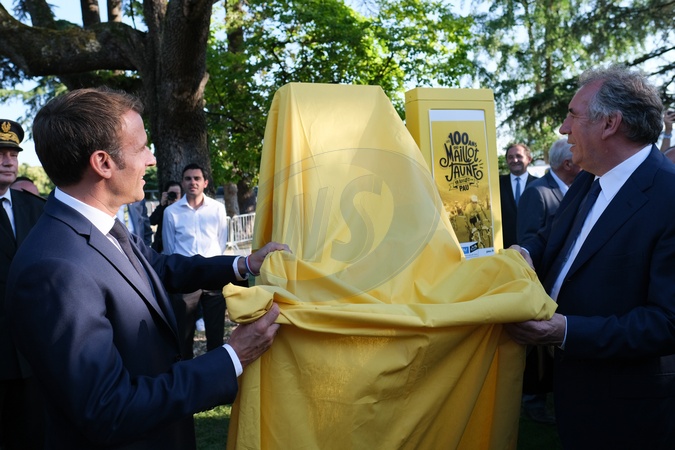 Macron pozuje do zdjec na ceremonii 100-lecia zoltej koszulki