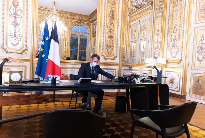 Emmanuel Macron w swoim biurze podczas pierwszej rozmowy w Joe Bidenem