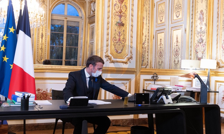 Emmanuel Macron w swoim biurze podczas pierwszej rozmowy w Joe Bidenem