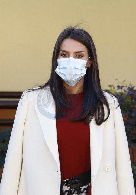 Krolowa Letizia w bialym plaszczyku i w spodnicy w pepitke