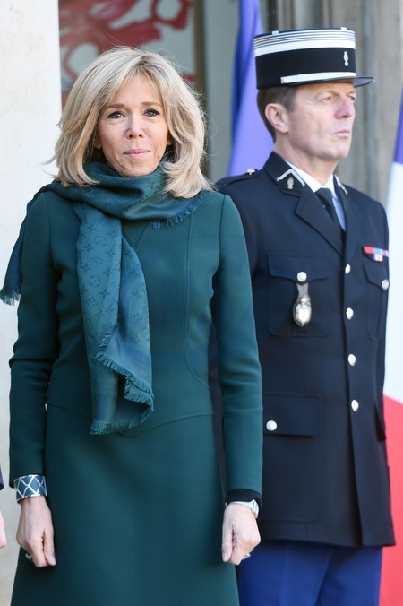 Brigitte Macron w zielonej butelkowej sukience i szalu louis vuitton