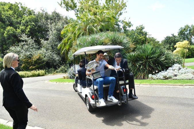 Novak Djokovic pozuje ze swoim trofeum w Krolewskich Ogrodach Botanicznych po wygraniu Australian Open 2020, Melbourne
