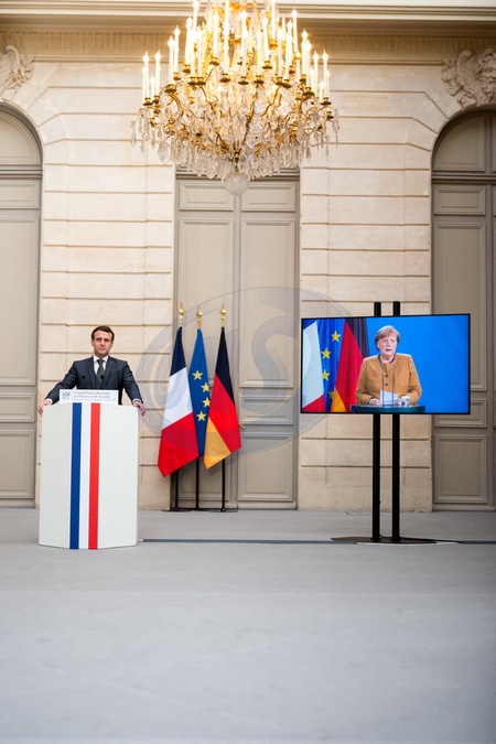 Emamnuel Macron i Angela Merkel podczas videokonferencji