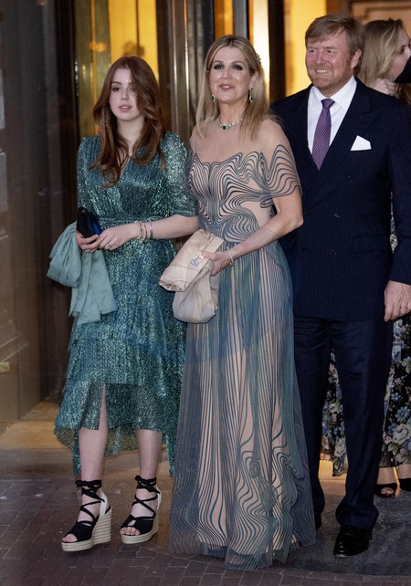 Krolowa Maxima i krol Willem Alexander z corkami przed teatrem