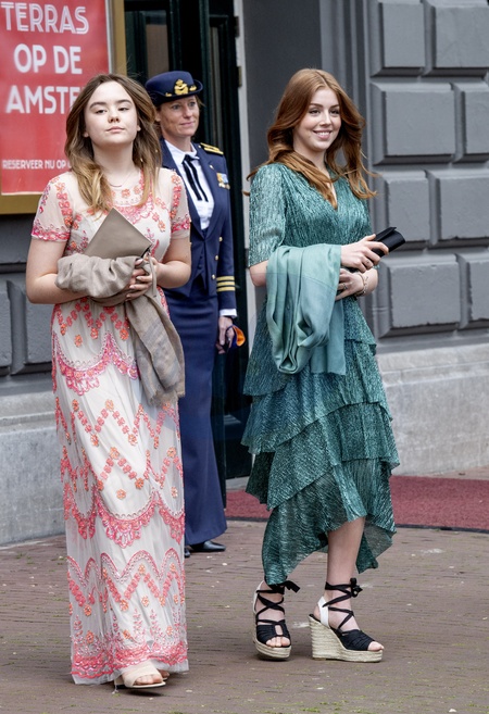 Krolowa Maxima i krol Willem Alexander z corkami przed teatrem