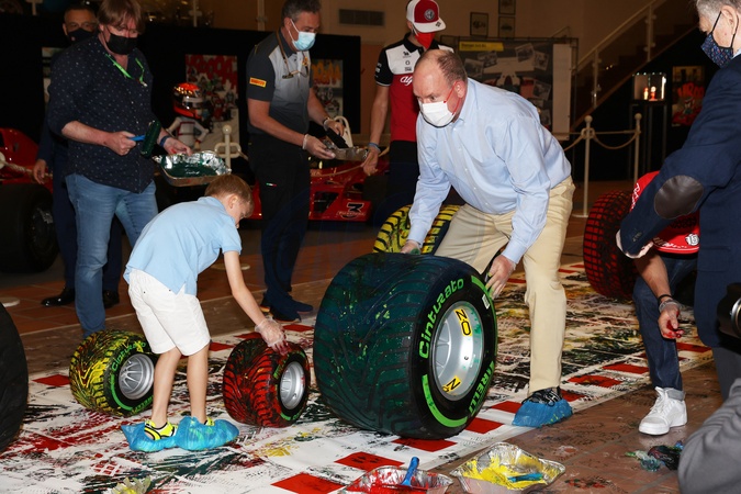 Ksiaze Albert z dziecmi tworza prace plastyczne na Grand Prix Monaco 2021