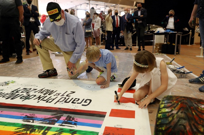 Ksiaze Albert z dziecmi tworza prace plastyczne na Grand Prix Monaco 2021