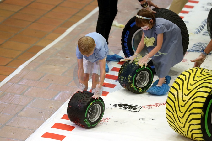 Ksiaze Albert z dziecmi tworza prace plastyczne na Grand Prix Monaco 2021