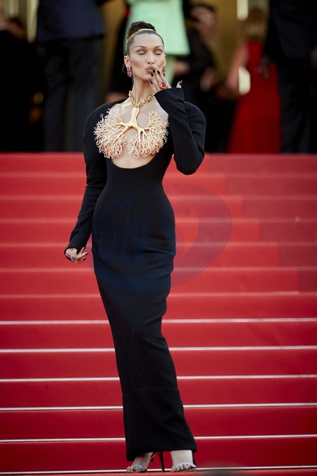 Cannes - Bella Hadid w dziwnej bizuterii - zastepuje stanik - czerwony dywan - Three Floors / Tre Piani