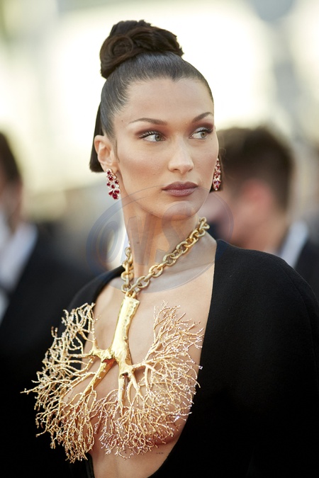 Cannes - Bella Hadid w dziwnej bizuterii - zastepuje stanik - czerwony dywan - Three Floors / Tre Piani