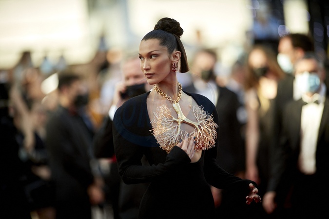 Cannes - Bella Hadid w dziwnej bizuterii - zastepuje stanik - czerwony dywan - Three Floors / Tre Piani