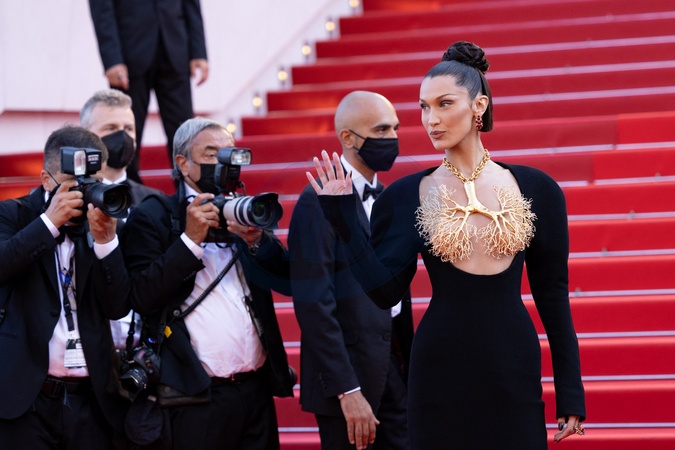 Cannes - Bella Hadid w dziwnej bizuterii - zastepuje stanik - czerwony dywan - Three Floors / Tre Piani