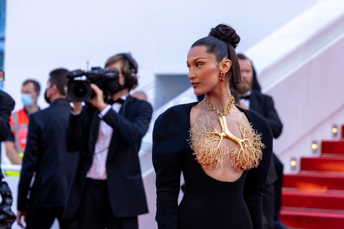 Cannes - Bella Hadid w dziwnej bizuterii - zastepuje stanik - czerwony dywan - Three Floors / Tre Piani