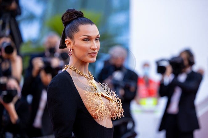Cannes - Bella Hadid w dziwnej bizuterii - zastepuje stanik - czerwony dywan - Three Floors / Tre Piani