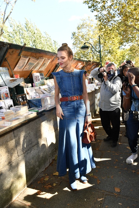 Natalia Vodianova w jeansowej sukience na pokazie Chloe