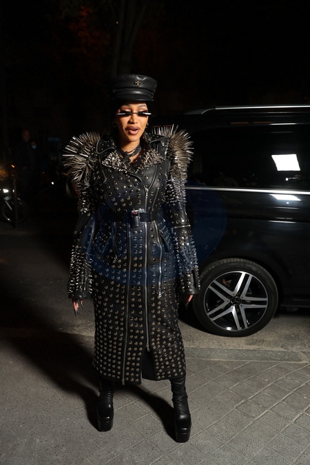 Cardi B w plaszczu z jetami, cwiekami i kolcami
