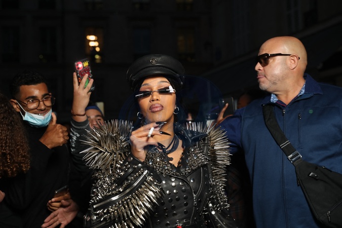 Cardi B w plaszczu z jetami, cwiekami i kolcami