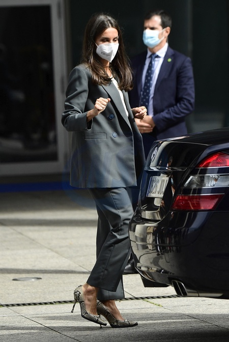 Krolowa Letizia w szarym garniturze i w butach z wezowej skorki