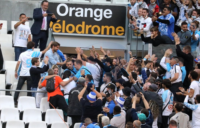 Rodzina i kibice na ceremonii pozegnania Bernarda Tapie na stadionie