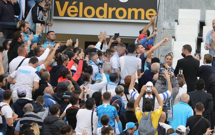 Rodzina i kibice na ceremonii pozegnania Bernarda Tapie na stadionie