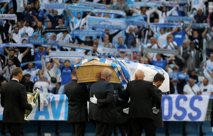 Rodzina i kibice na ceremonii pozegnania Bernarda Tapie na stadionie