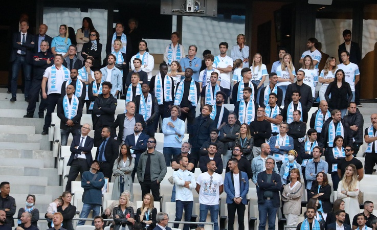 Rodzina i kibice na ceremonii pozegnania Bernarda Tapie na stadionie