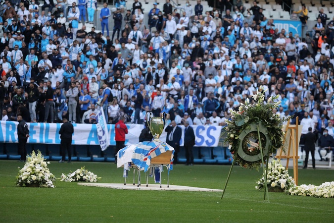 Rodzina i kibice na ceremonii pozegnania Bernarda Tapie na stadionie