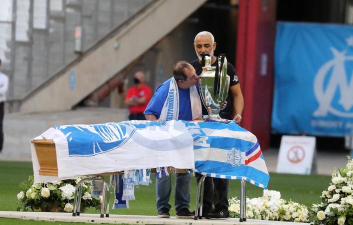 Rodzina i kibice na ceremonii pozegnania Bernarda Tapie na stadionie