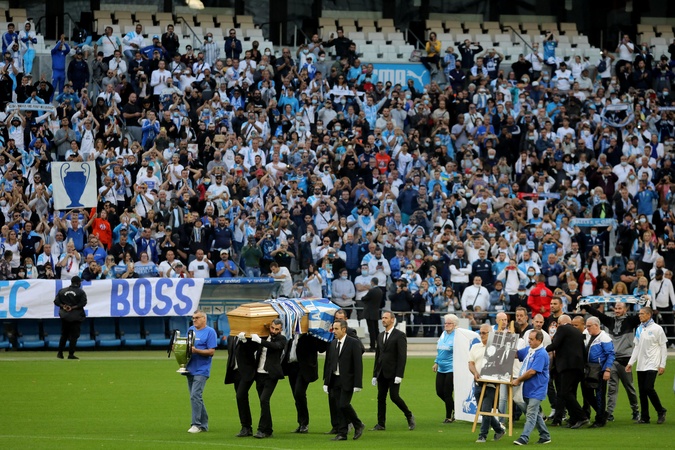 Rodzina i kibice na ceremonii pozegnania Bernarda Tapie na stadionie