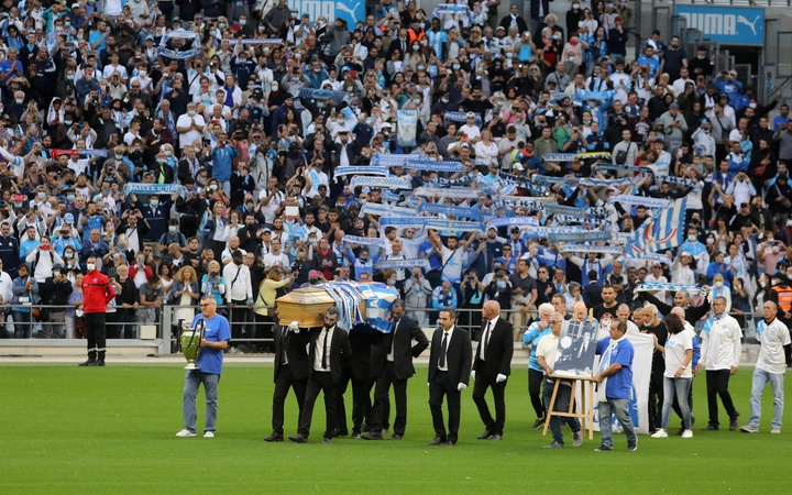 Rodzina i kibice na ceremonii pozegnania Bernarda Tapie na stadionie