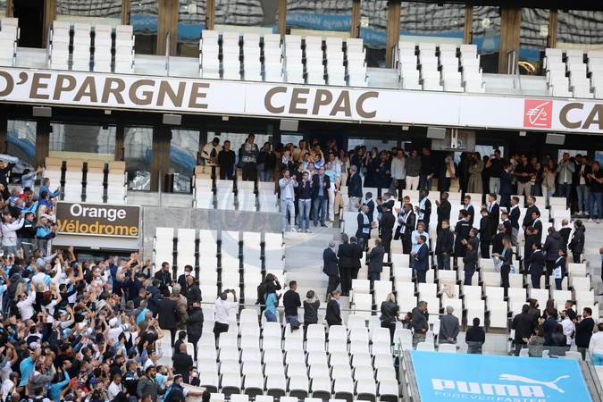 Rodzina i kibice na ceremonii pozegnania Bernarda Tapie na stadionie