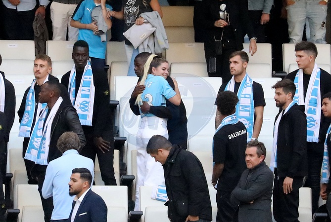 Rodzina i kibice na ceremonii pozegnania Bernarda Tapie na stadionie