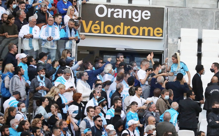 Rodzina i kibice na ceremonii pozegnania Bernarda Tapie na stadionie