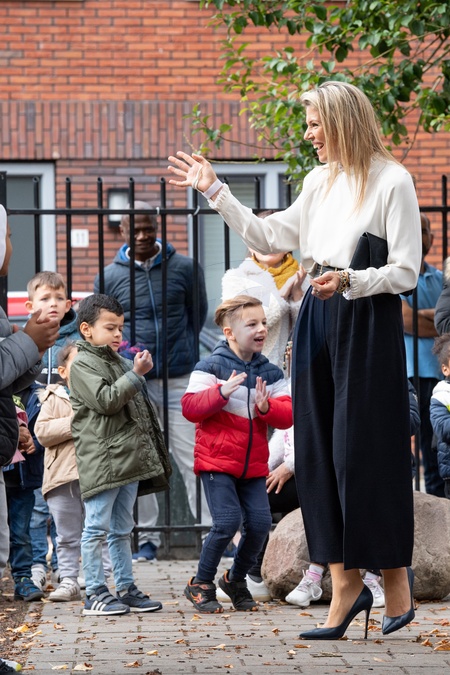 Krolowa Maxima ubrana na galowo podczas wizyty w szkole