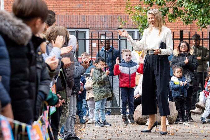 Krolowa Maxima ubrana na galowo podczas wizyty w szkole