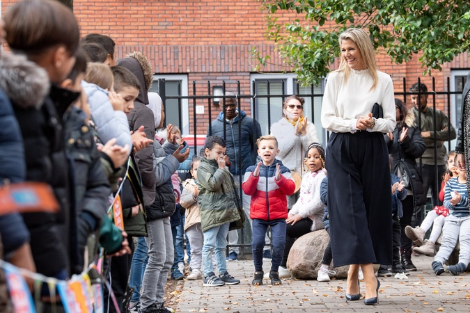 Krolowa Maxima ubrana na galowo podczas wizyty w szkole