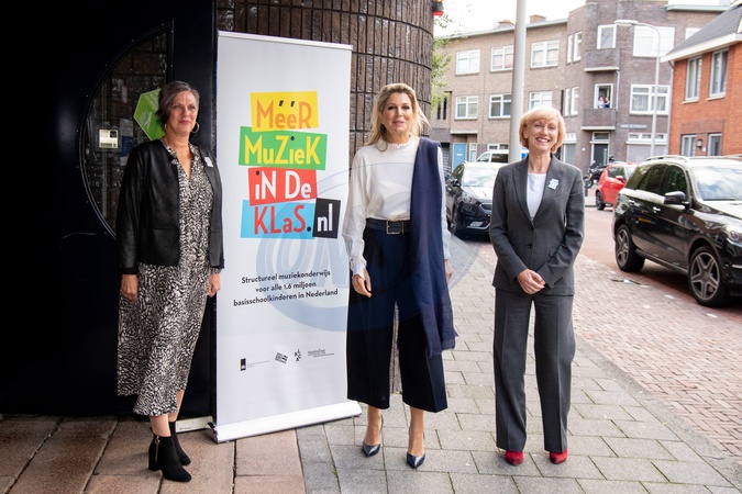 Krolowa Maxima ubrana na galowo podczas wizyty w szkole