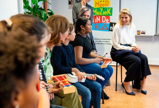 Krolowa Maxima ubrana na galowo podczas wizyty w szkole