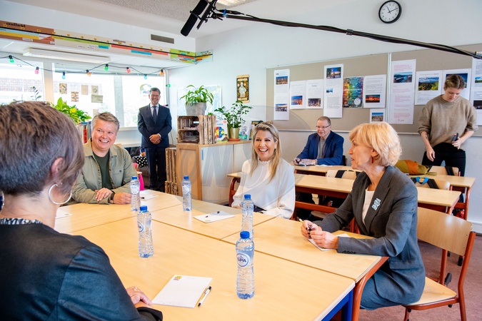 Krolowa Maxima ubrana na galowo podczas wizyty w szkole