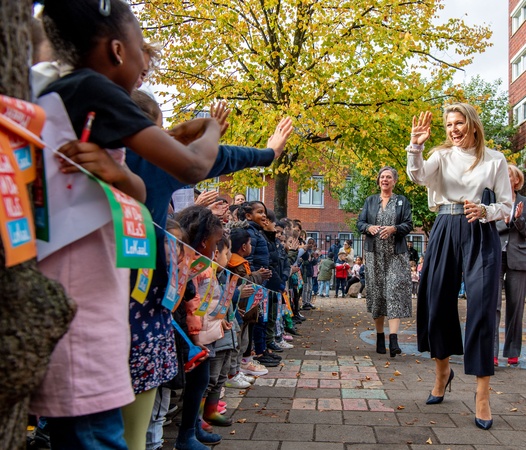 Krolowa Maxima ubrana na galowo podczas wizyty w szkole