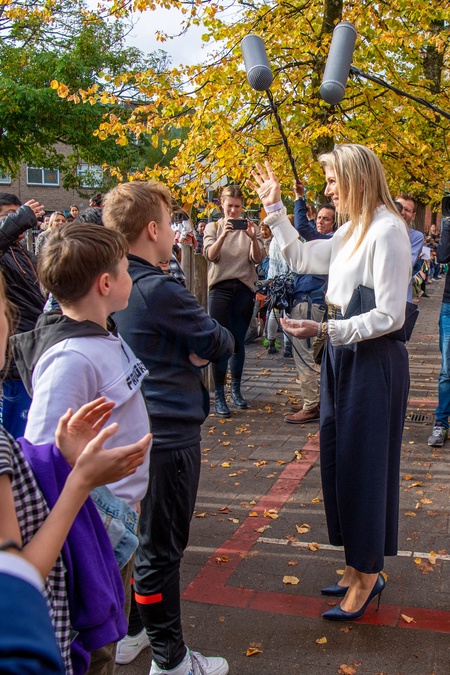 Krolowa Maxima ubrana na galowo podczas wizyty w szkole