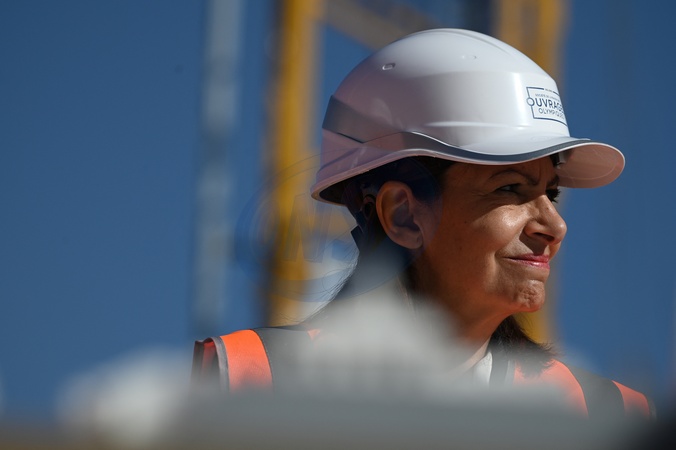Emmanuel Macron i Anne Hidalgo w przyszlym miasteczku olimpijskim