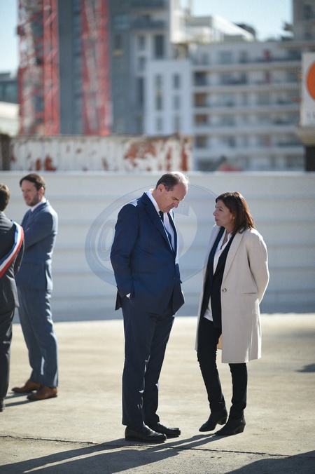 Emmanuel Macron i Anne Hidalgo w przyszlym miasteczku olimpijskim