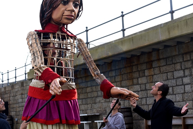 Jude Law z „Little Amal”, 3,5-metrową marionetka mlodej syryjskiej uchodzczyni