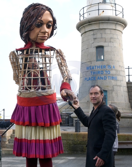 Jude Law z „Little Amal”, 3,5-metrową marionetka mlodej syryjskiej uchodzczyni