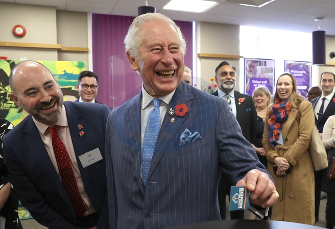Rozbawiony ksiaze Karol podczas The Prince's Trust Young Entrepreneurs