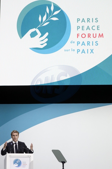 Kamala Harris i Emmanuel Macron na otwarciu Paris Peace Forum
