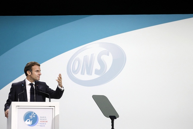 Kamala Harris i Emmanuel Macron na otwarciu Paris Peace Forum