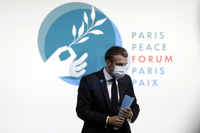 Kamala Harris i Emmanuel Macron na otwarciu Paris Peace Forum