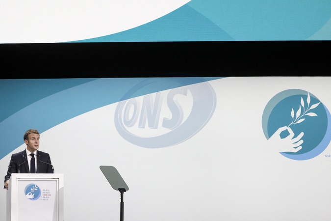 Kamala Harris i Emmanuel Macron na otwarciu Paris Peace Forum